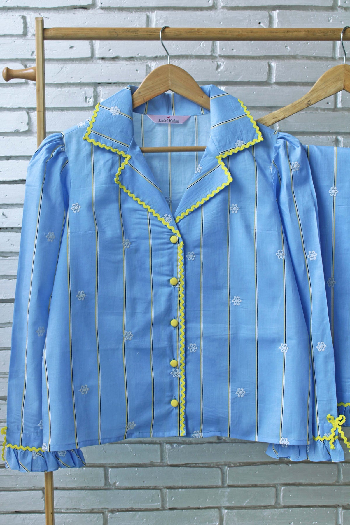 Introducing our Blue Petals Night Suit Set designed on a soothing light blue base with cheerful yellow and black stripes for a fresh, playful look. Adorned with delicate white flower embroidery and finished with bright yellow piping on the shirt and pyjama, this set is completed with charming ruffle details for that signature Kuhoo touch. The fabric has a light, airy feel with slight transparency, making it perfect for relaxed lounging. Available for a limited time only, so don’t miss adding this dreamy set to your nightwear collection.