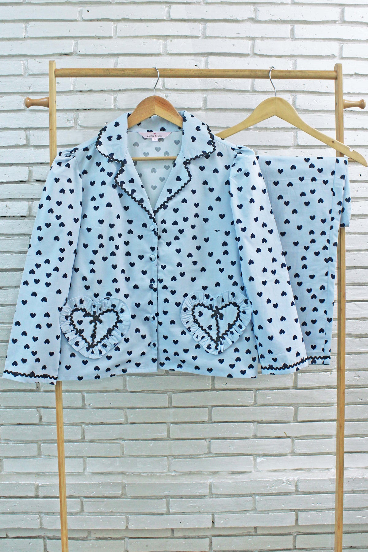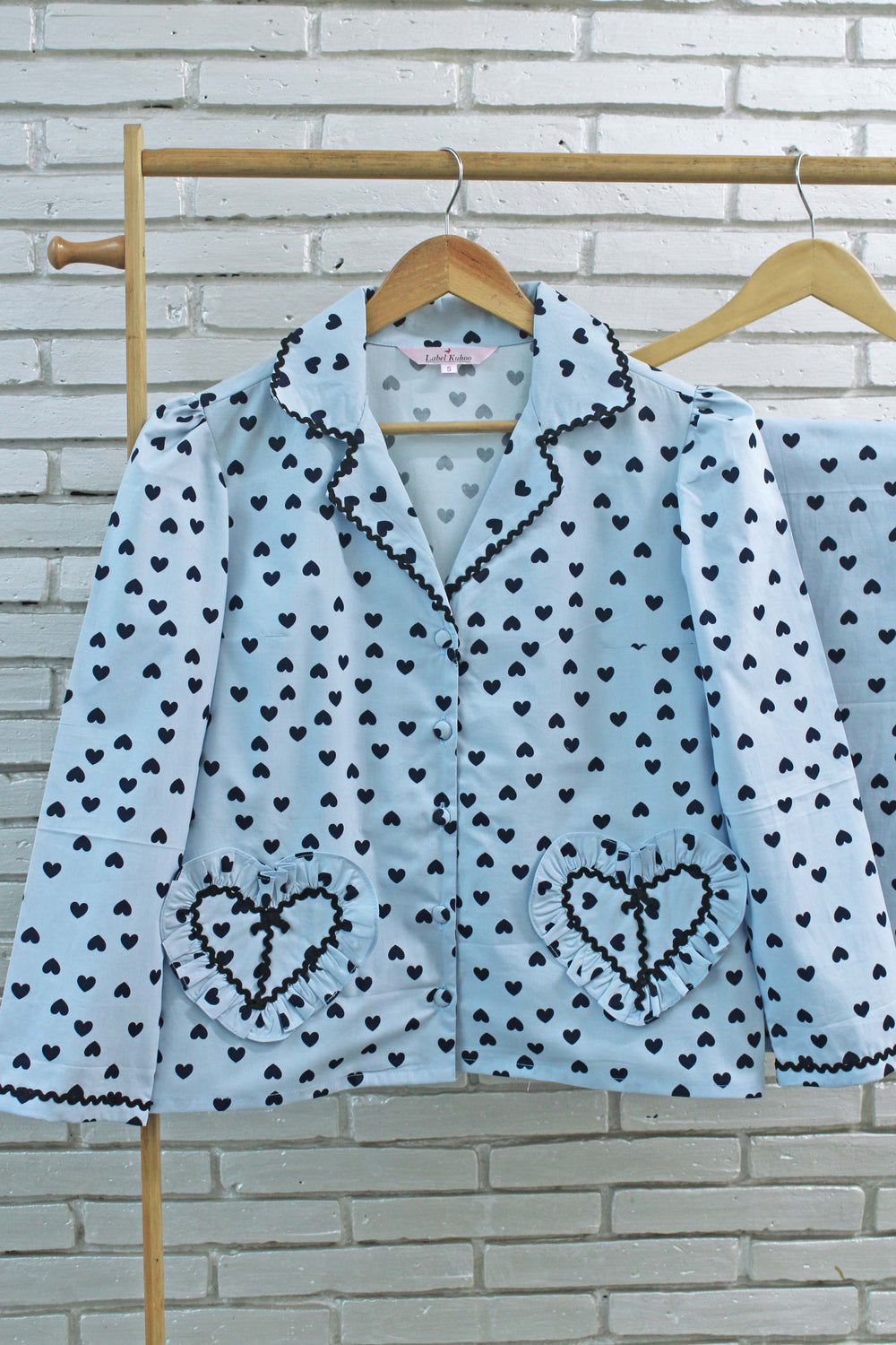 Introducing the Bluemoon Hearts Night Suit Set, where soft romance meets effortless comfort. Crafted in a soothing light blue base, this charming set is adorned with delicate black heart prints that add a timeless Valentine touch. Finished with refined black piping, heart-shaped ruffles, and dainty bow details, every element is thoughtfully designed to feel graceful yet playful. Perfect for cozy nights, slow mornings, and moments wrapped in love and comfort.