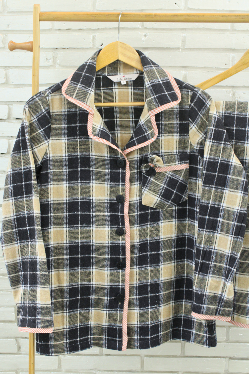 Introducing the Brownie Bliss Night Suit Set, a delightful blend of warmth and style. This charming set features a soothing light cream brown and black color combination, offering a sophisticated yet cozy vibe. The sweet bow on the pocket adds a playful touch, while the vibrant orange and white checkered piping that runs throughout the set gives it a lively and modern edge. The button size and design may vary slightly from the image. Made from soft, luxurious flannel fabric, this night suit ensures ultimate comfort for a peaceful night's rest. The Brownie Bliss Night Suit Set is the perfect choice for those who appreciate both comfort and a touch of flair in their sleepwear collection.