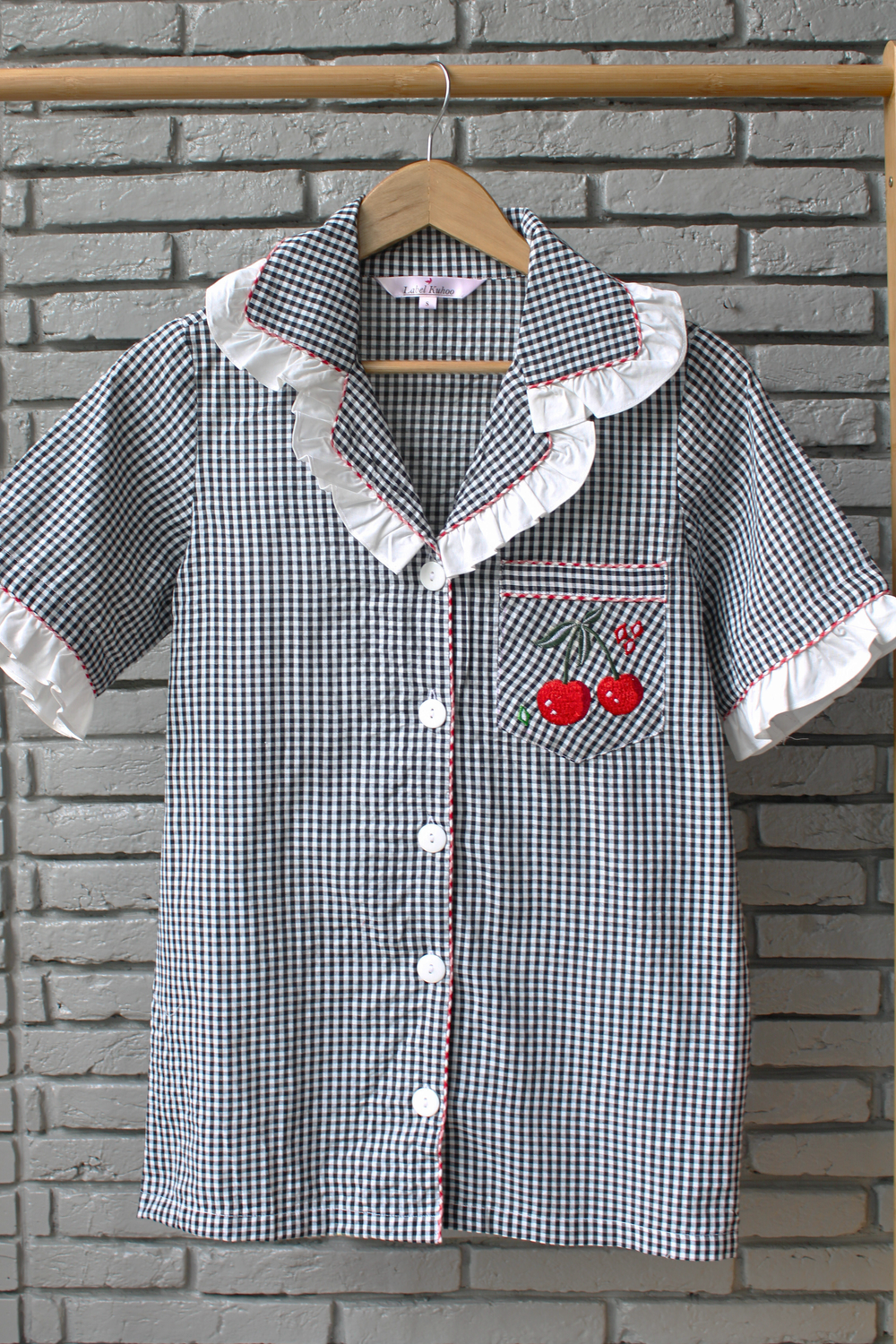 Introducing the Cherry Shorts Set a delightful combination of comfort and style for your laid-back moments. This playful set features a classic black and white checkered pattern, with flirty ruffle accents on the sleeves and collar. The cherry embroidery on the pocket adds a touch of whimsy and charm. Perfect for lounging or a cozy night in, this shorts set ensures you stay stylish and comfortable.