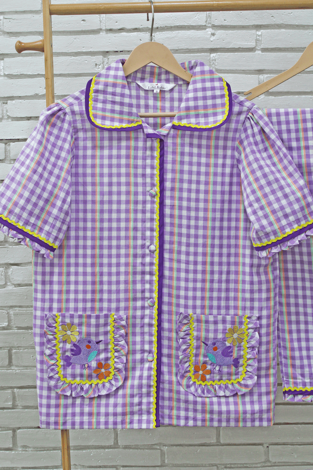 Introducing the Chirpy Charm Night Suit Set. With a playful purple and white check base, this set is designed to bring charm and comfort to your evenings. The pockets feature delicate ruffle work, while the cute embroidery of birds and flowers adds a whimsical touch. A perfect blend of coziness and style, it’s the ideal choice for a sweet and relaxing night.