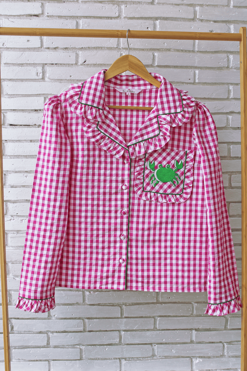 Introducing the Crab Night Suit Set – a perfect blend of comfort and charm. Crafted with a soft pink and white checkered base, this set features delicate ruffle detailing on the collar, sleeves, pockets, and the bottom of the pyjamas, adding a sweet and feminine touch. The highlight of this set is the adorable crab embroidery on the pocket, bringing a fun, playful vibe to your bedtime look.