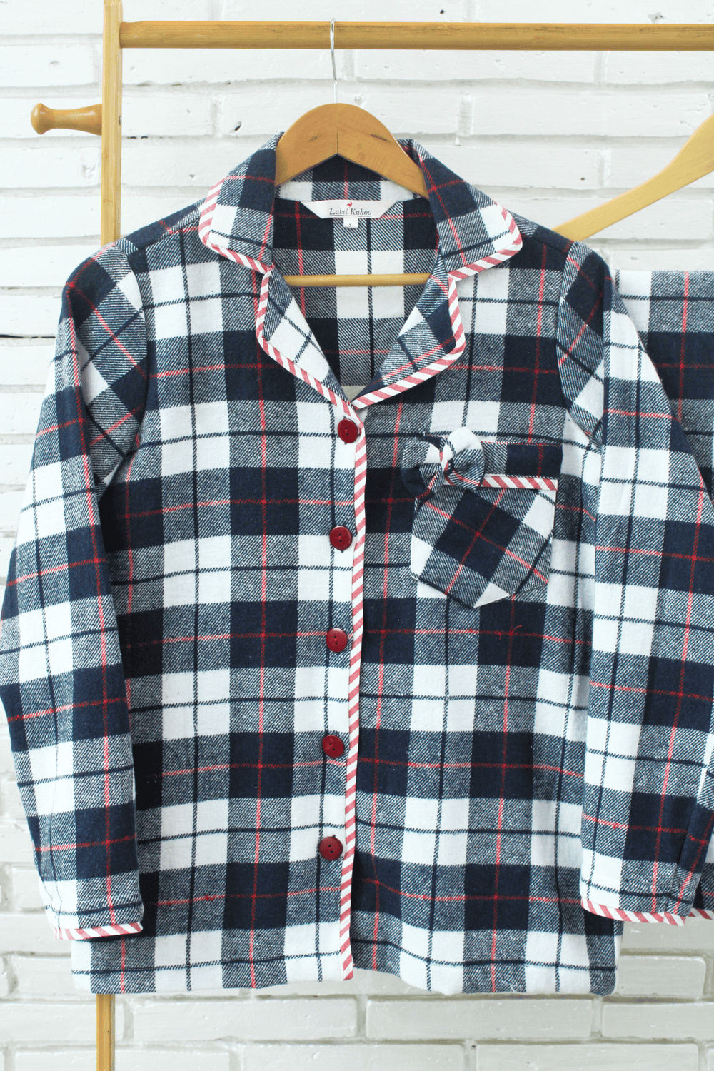 Introducing the Dusky Blue Night Suit Set, a stunning combination of rich color and cozy elegance. This set features a deep dark blue and white base, accented with bold red lines that add a vibrant contrast. The charming bow on the pocket enhances its playful yet sophisticated look, while the red and white piping along the edges gives a polished finish. The button size and design may vary slightly from the image. Made from soft and luxurious flannel fabric, this night suit is designed for ultimate comfort and warmth, perfect for chilly evenings.
