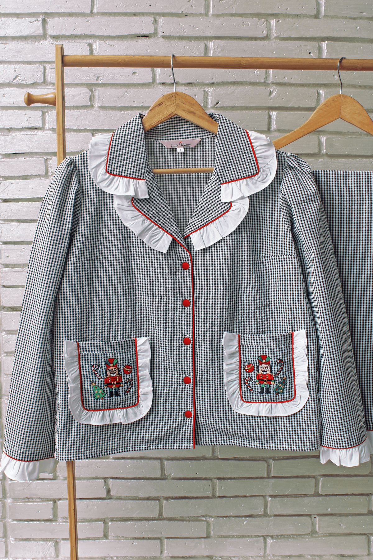 Introducing the Gingham Nutcracker Night Suit Set, a timeless festive piece designed for cozy and cheerful winter nights. Set on a classic black and white gingham base, this night suit is beautifully finished with soft white ruffle detailing on the collar, sleeves, pockets, and the hem of the pyjamas. Bold red piping adds a striking Christmas touch, perfectly complementing the monochrome checks. The highlight of the set lies in its two charming pockets, adorned with delightful Nutcracker, Christmas tree, and candy embroidery. A perfect mix of elegance, comfort, and festive spirit, this set is made to make your Christmas nights extra special.
