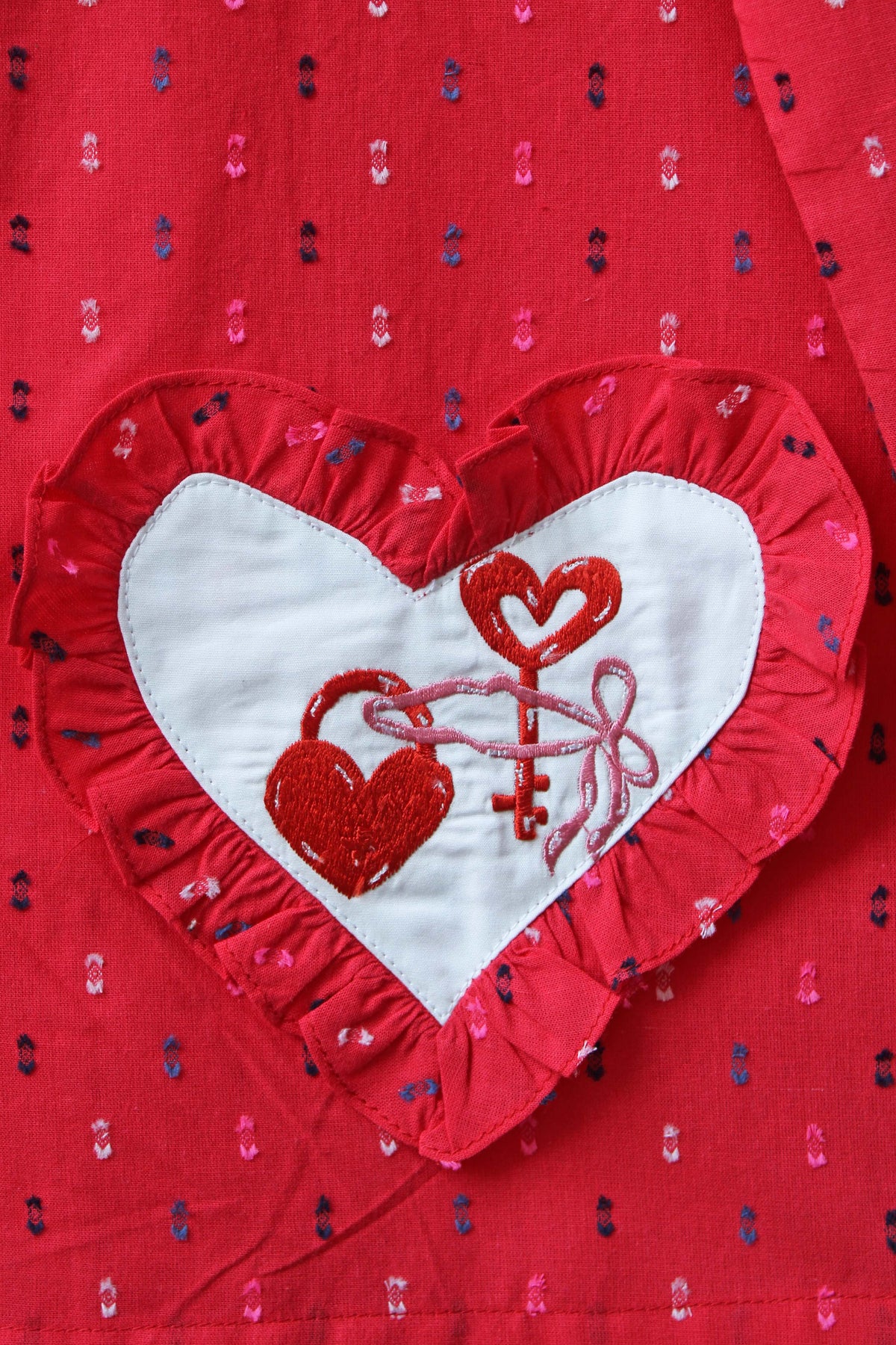 Introducing the Heartlock Romance Night Suit Set, crafted in rich red dobby fabric that speaks pure romance. Designed with delicate ruffle detailing and charming bow accents on the front, this set’s true highlight is the exquisite heart-lock embroidery paired with a tiny key, symbolising love sealed forever. Finished with soft ruffle touches, it’s the perfect blend of playful elegance and cozy comfort for nights wrapped in romance.