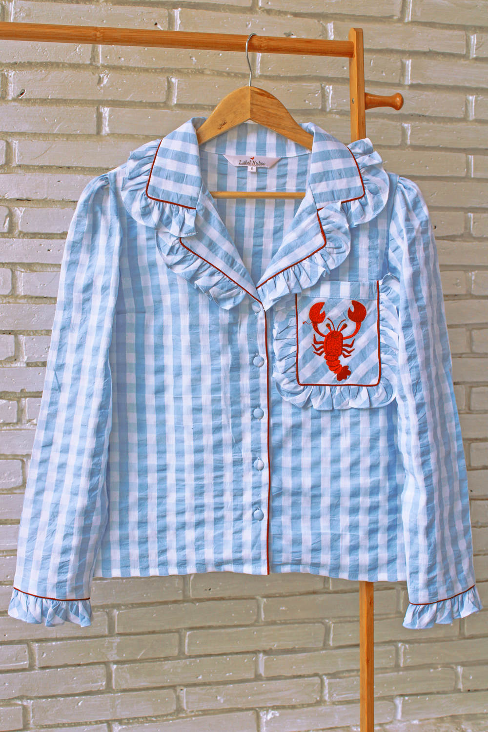 Introducing the Lobster Night Suit Set – a delightful blend of coastal charm and cozy comfort. This set features a soothing blue and white checkered base, beautifully accented with soft ruffle detailing on the collar, sleeves, pockets, and the bottom of the pyjamas. The true showstopper is the playful lobster embroidery on the pocket, adding a fun, seaside-inspired twist to your bedtime look. Perfect for those who love to lounge in style with a splash of personality.