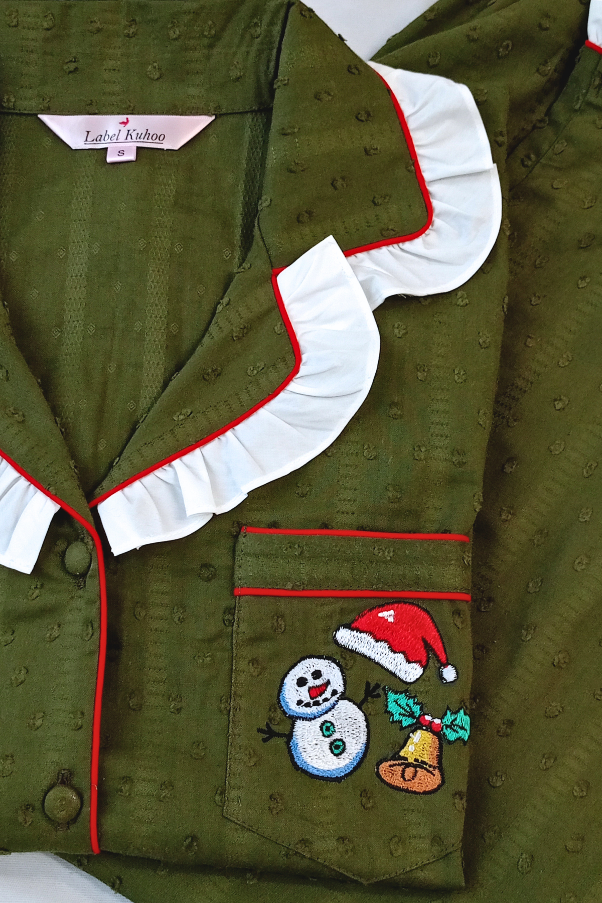 Introducing our Merry Snowman Night Suit Set, a cozy and festive essential designed to make your winter nights extra special. Crafted from a soft, textured olive green fabric, this set is thoughtfully detailed with contrasting red piping and elegant white ruffle accents along the collar, sleeves, and hem. The adorable snowman embroidery on the pocket adds a playful Christmas touch, making it perfect for the holiday season. Comfortable, warm, and beautifully detailed, this night suit blends festive charm with everyday comfort, ideal for relaxing at home and enjoying joyful winter moments.
