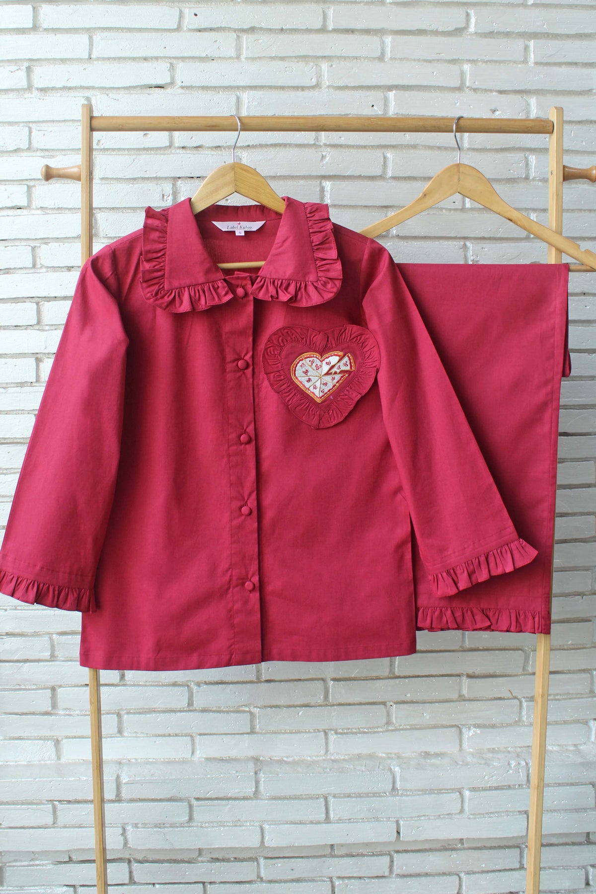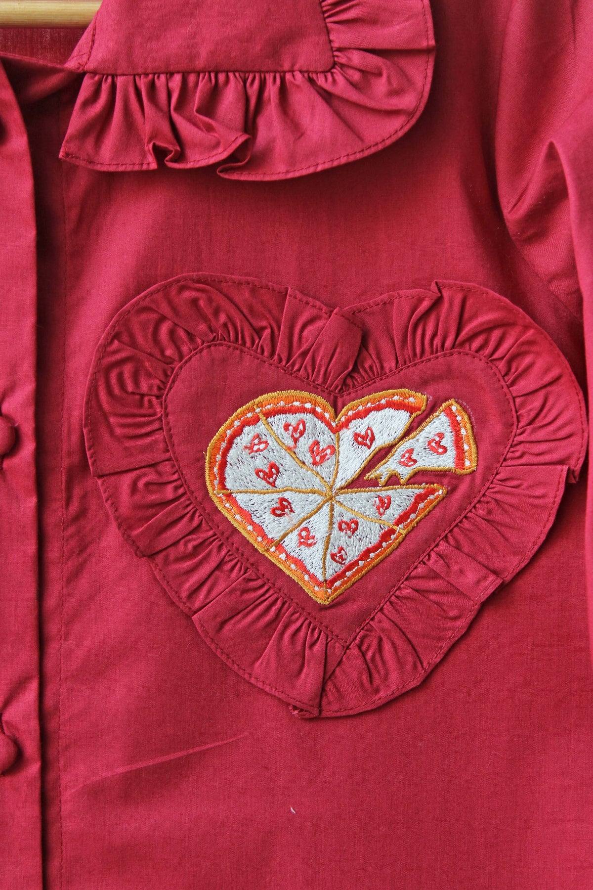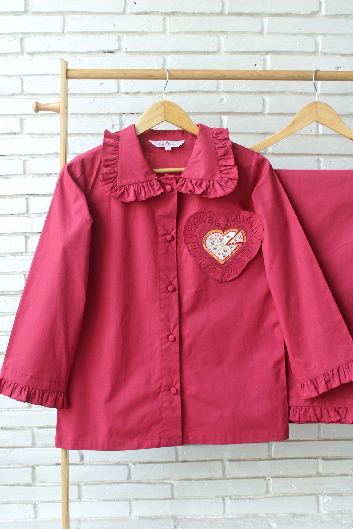 Introducing the Pizza Love Night Suit Set, designed on a bold red solid base that brings fun and warmth together. Finished with delicate ruffle detailing, this set features a charming heart-shaped pocket highlighted with an adorable heart pizza embroidery, adding a playful twist to classic romance. A perfect blend of comfort and quirky charm, it’s made for cozy nights filled with love and little cravings.