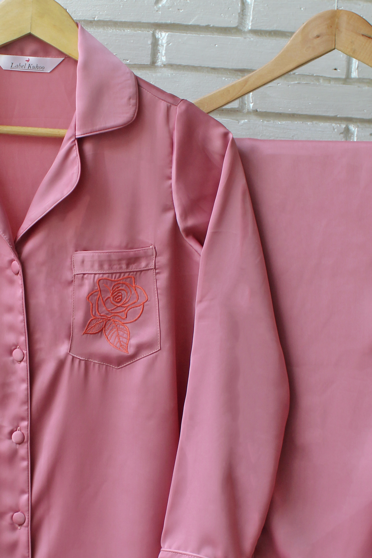 Introducing the Rose Bloom Night Suit Set, a blend of grace and charm in every detail. Designed on a dusky pink satin base with soft pink piping all over, this set beautifully captures feminine elegance. The highlight lies in the intricate rose flower embroidery on the pocket, adding a romantic touch to your nighttime look. Slip into its smooth satin comfort and let the delicate rose bloom bring a hint of luxury to your evenings.