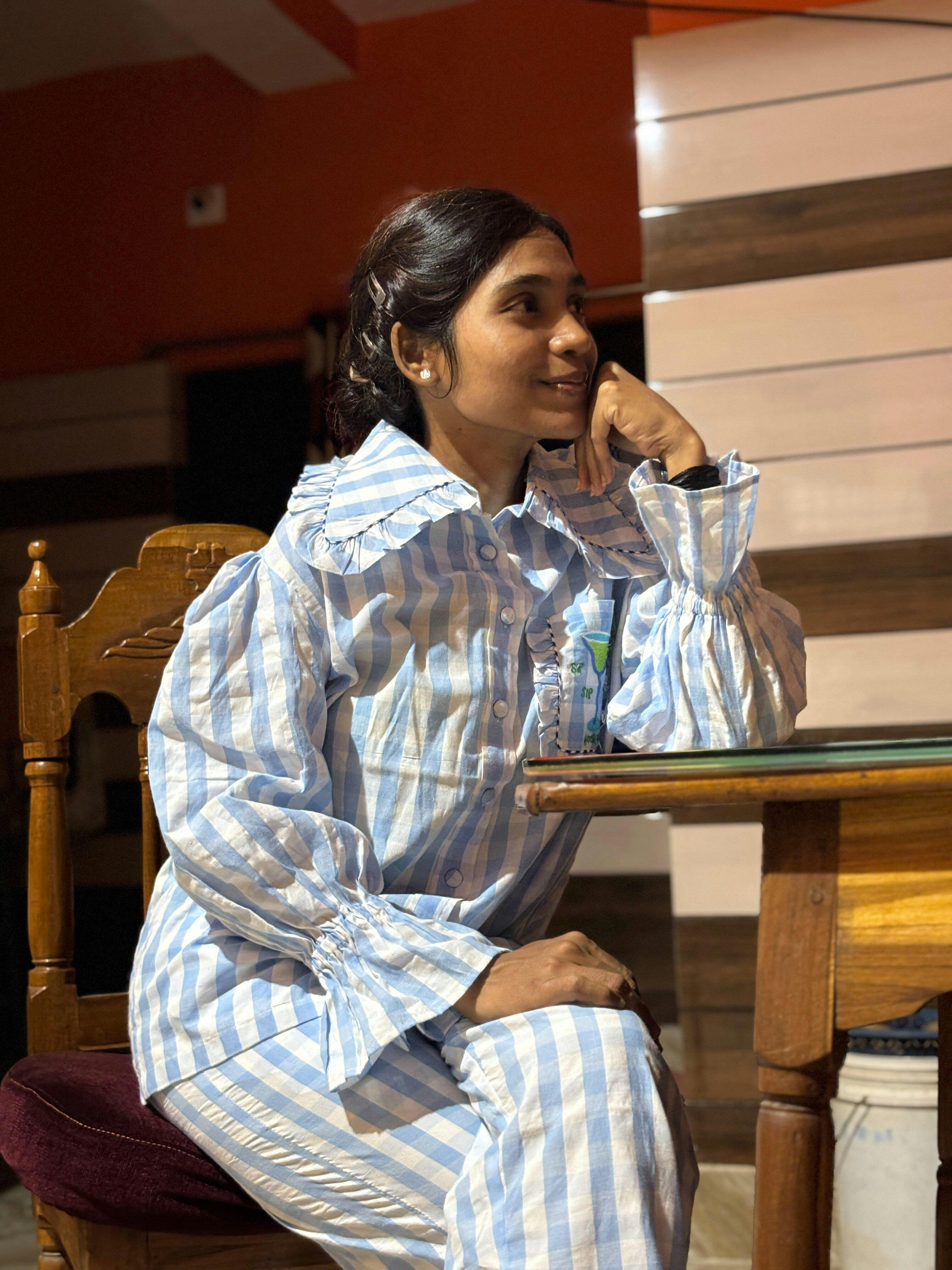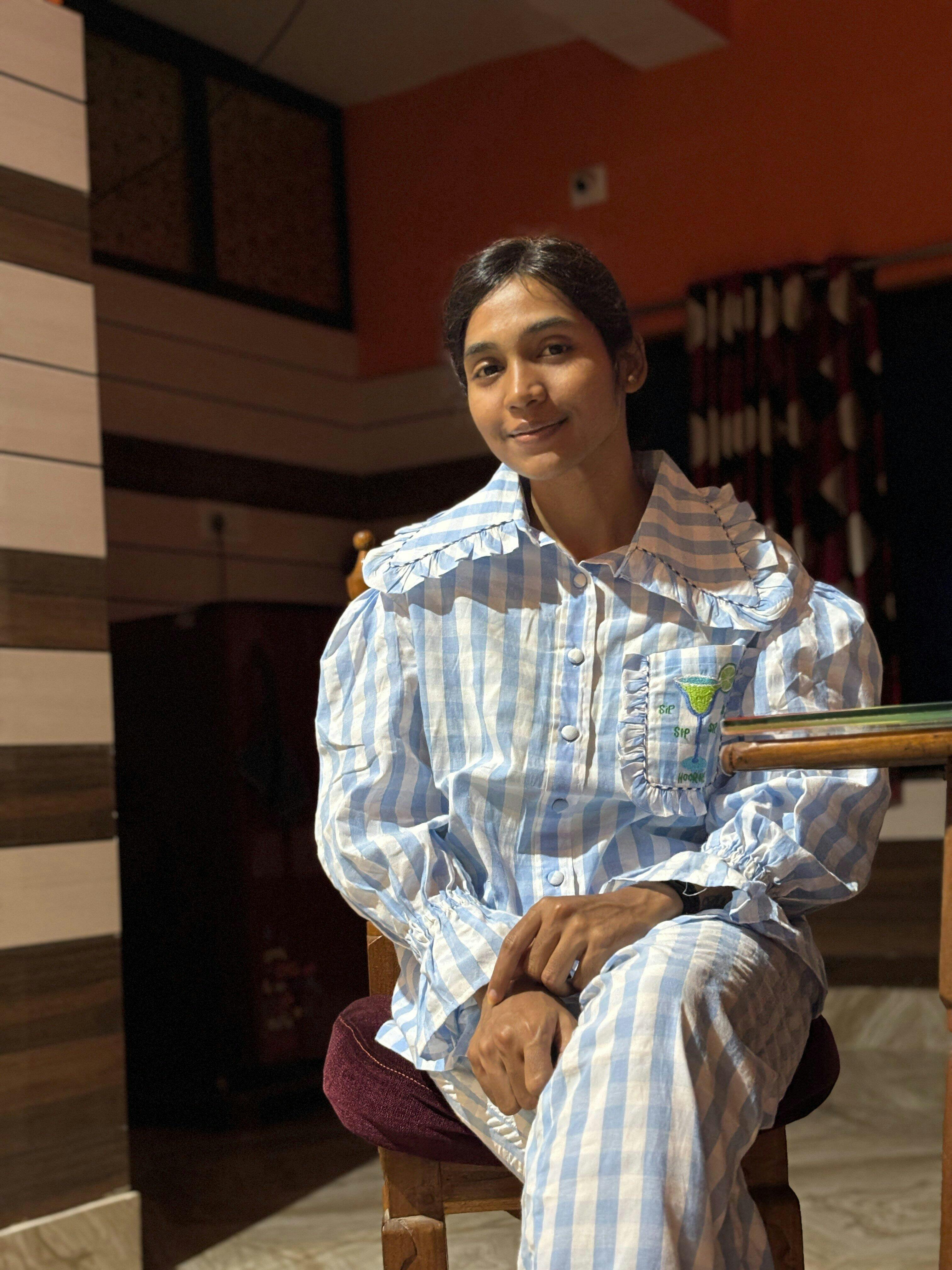 Introducing our Sip Sip Hooray Night Suit Set – a zesty celebration of comfort and style inspired by the spicy Margarita! This vibrant set features bold blue and white checks, adorned with playful check ruffle work on the collar, sleeves, and pocket. The standout detail is the detailed handmade embroidery of a spicy Margarita on the pocket, capturing the bold and refreshing spirit of this iconic cocktail. Perfect for relaxing or enjoying lively evenings, this set blends luxurious comfort with a splash of spirited flair. Sip, celebrate, and embrace the zest of the Sip Sip Hooray Night Suit Set.