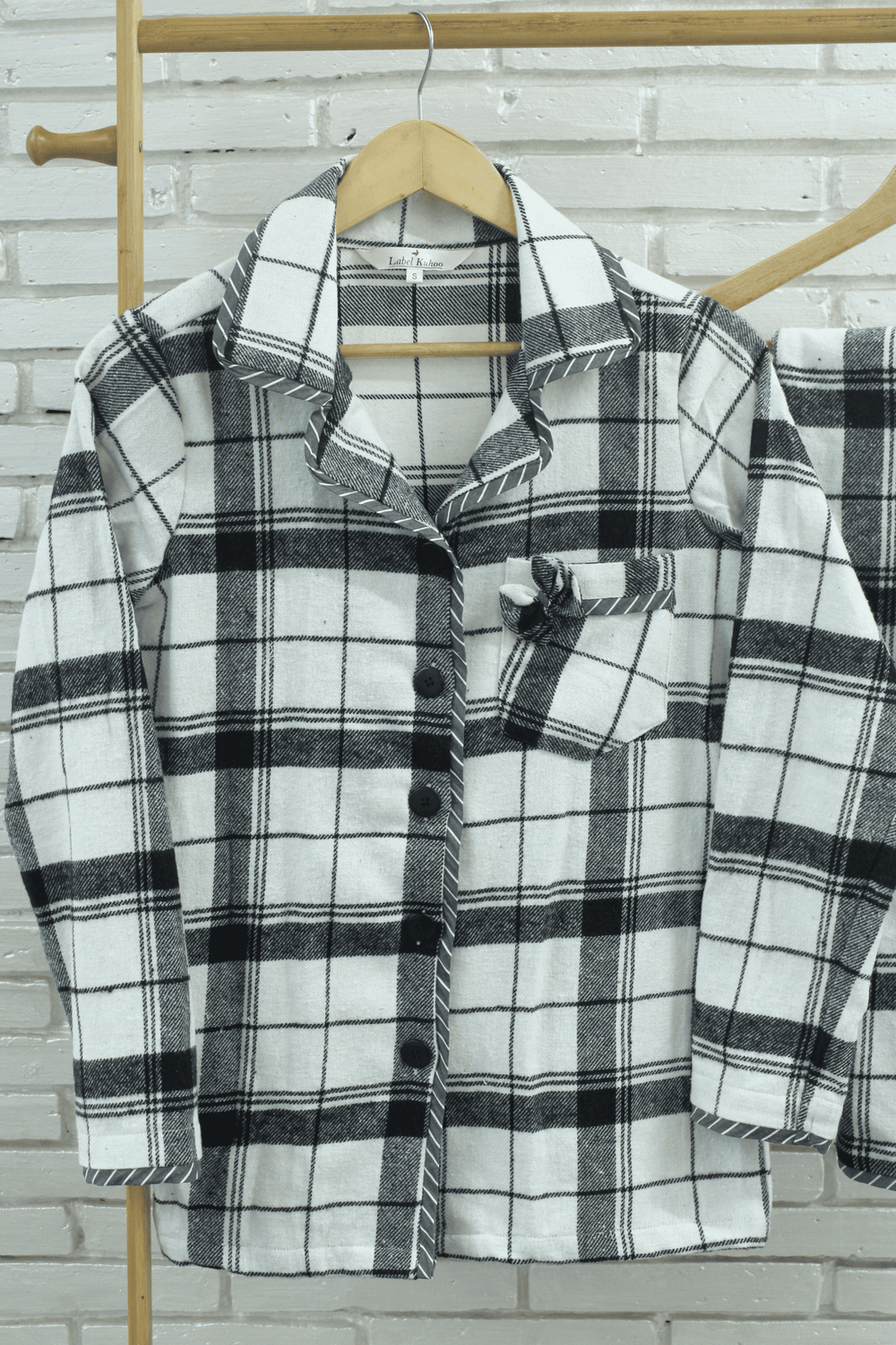 Introducing the Snowy Bliss Night Suit Set, a stylish and cozy addition to your sleepwear collection. This elegant set features a classic black and white color combination, offering a timeless and chic look. The sweet bow on the pocket adds a charming touch, while the grey and white piping that runs throughout the set enhances its sophisticated appeal. The button size and design may vary slightly from the image. Made from soft, luxurious flannel fabric, this night suit ensures warmth and comfort for a peaceful night’s rest. The Snowy Bliss Night Suit Set is perfect for those who appreciate both comfort and understated elegance in their sleepwear.