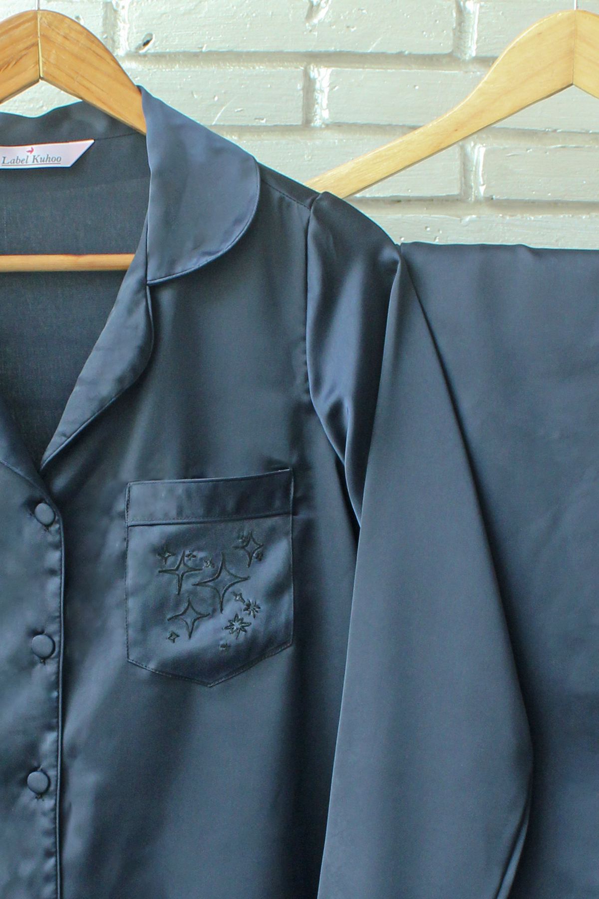 Introducing the Sparkling Moonstone Night Suit Set a sleek solid black satin set with matching piping all over for a polished, elegant look. The standout feature is the sparkling star embroidery on the pocket, adding a touch of celestial charm to your nighttime style.