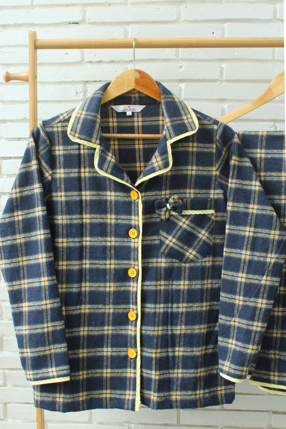 Introducing our Sunny Bliss Night Suit Set, a radiant burst of comfort and joy. Crafted from soft, cozy flannel fabric, this set is designed to keep you warm and relaxed through every peaceful night. The cheerful combination of yellow and blue brings a sunny vibe, with a cute bow on the pocket adding a playful touch. The yellow and white piping enhances the set's bright feel. The button size and design may vary slightly from the image. Embrace the warmth and cheer of our Sunny Bliss Night Suit Set by Label Kuhoo your ultimate companion for restful nights and sunny dreams.