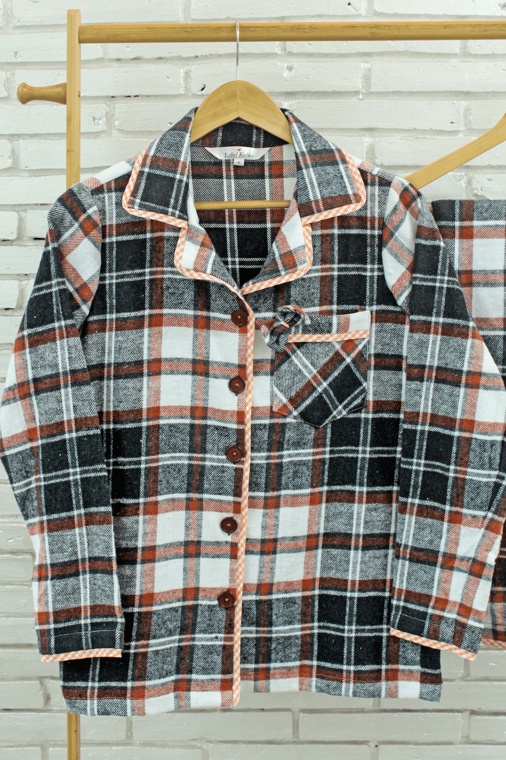 Introducing the Sweetberry Bliss Night Suit Set, a vibrant fusion of bold colors and cozy comfort. This set features a rich dark cherry red and black combination, accented with crisp white details and a playful bow on the pocket. The striking orange and white piping adds a lively contrast. The button size and design may vary slightly from the image. Crafted from soft, luxurious flannel fabric, this night suit promises warmth and relaxation for chilly nights, making it perfect for anyone who loves a pop of color and stylish comfort in their sleepwear collection.
