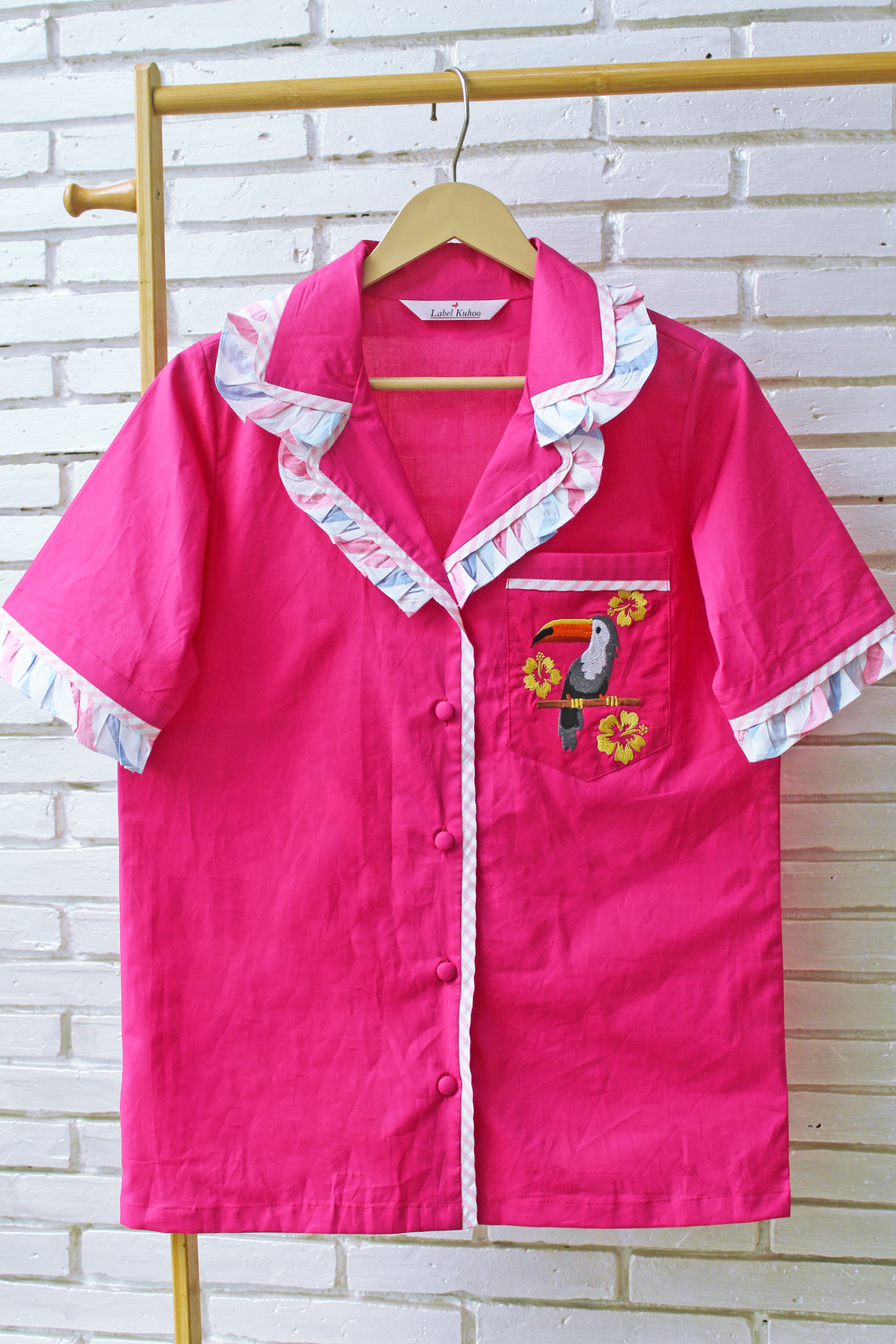 Introducing the Toucan Bloom Shorts Set. With a soft solid pink base, this set is designed with feminine ruffle detailing along the collar, sleeves, and the hems of the shorts for an elegant, playful touch. The highlight is the beautifully embroidered pink toucan, surrounded by delicate floral accents, on the pocket—bringing a splash of tropical charm to your wardrobe. Crafted from soft, breathable fabric, this set ensures both comfort and style, making it the perfect choice for warm evenings, relaxed mornings, or cozy lounging at any time.