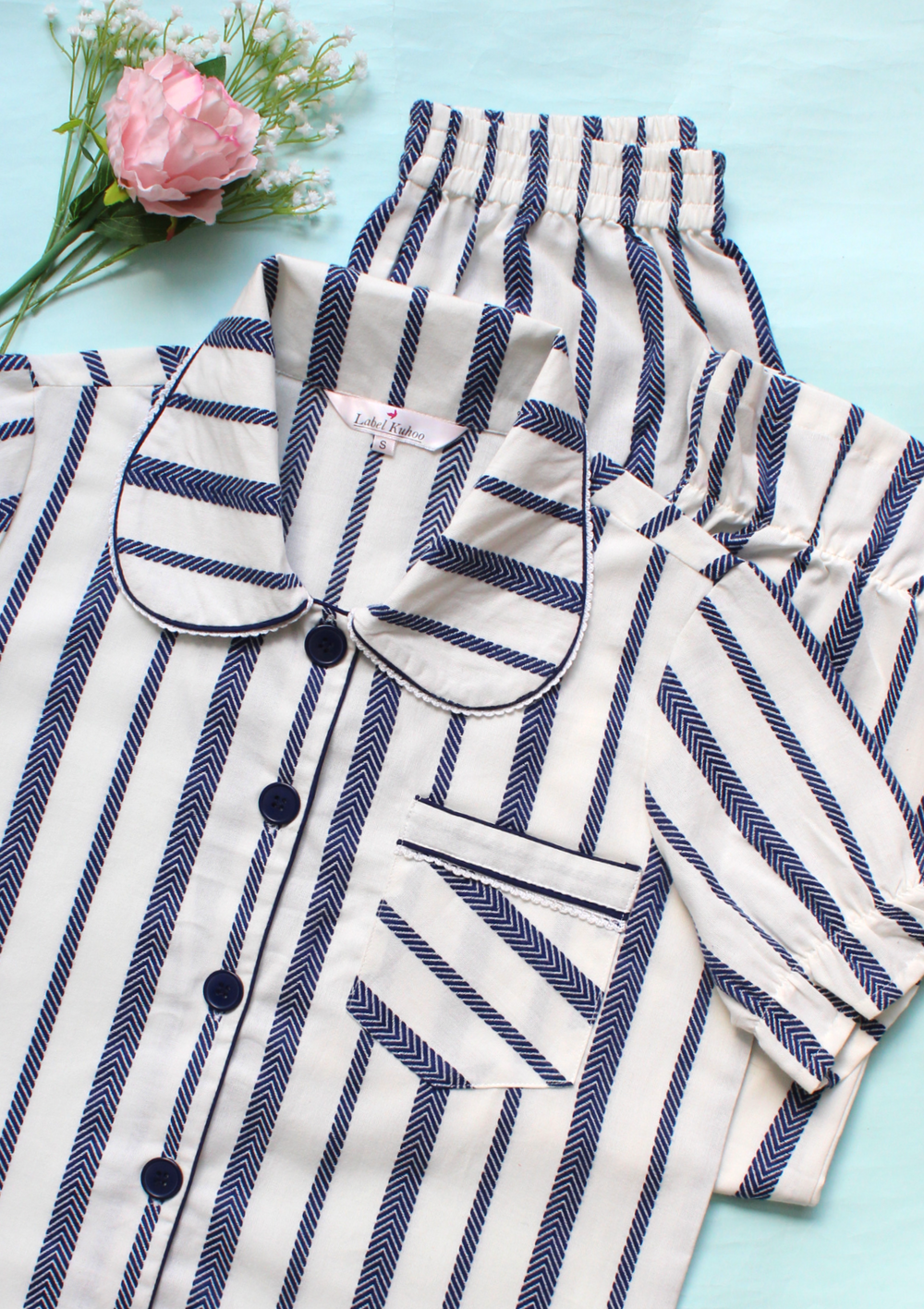 Our Waves Night Suit Set is the prettiest of ‘em all! The lovely blue embroidered stripes on the pure white cotton set is absolutely charming! This set has elastic detailing on the sleeves & pyjamas to add more grace to the set & lovely lace detailing on the collar & pocket! This set is a must have 💙🤍